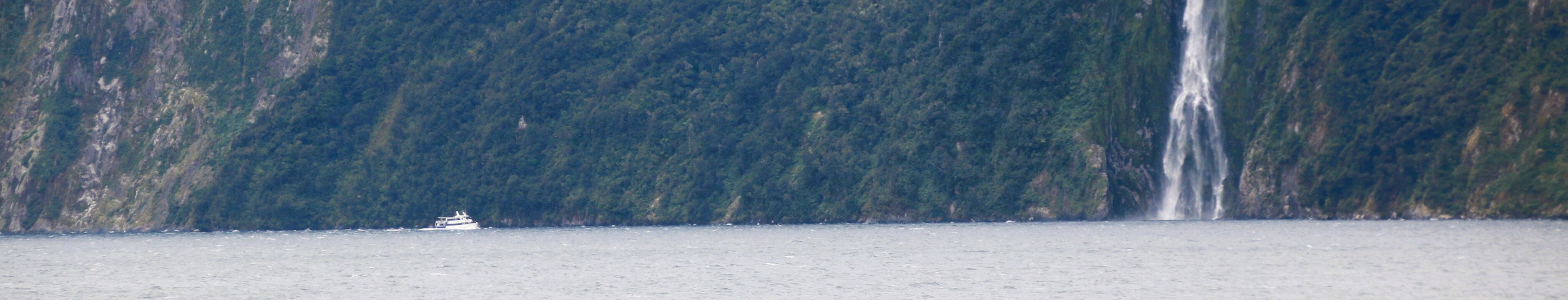 Sterling Falls as seen from the stern of our ship as we cruised the Milford Sound. With a mean annual rainfall of 252 inches each year Milford Sound is known as…