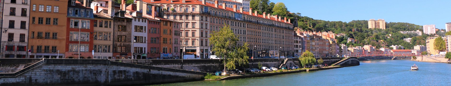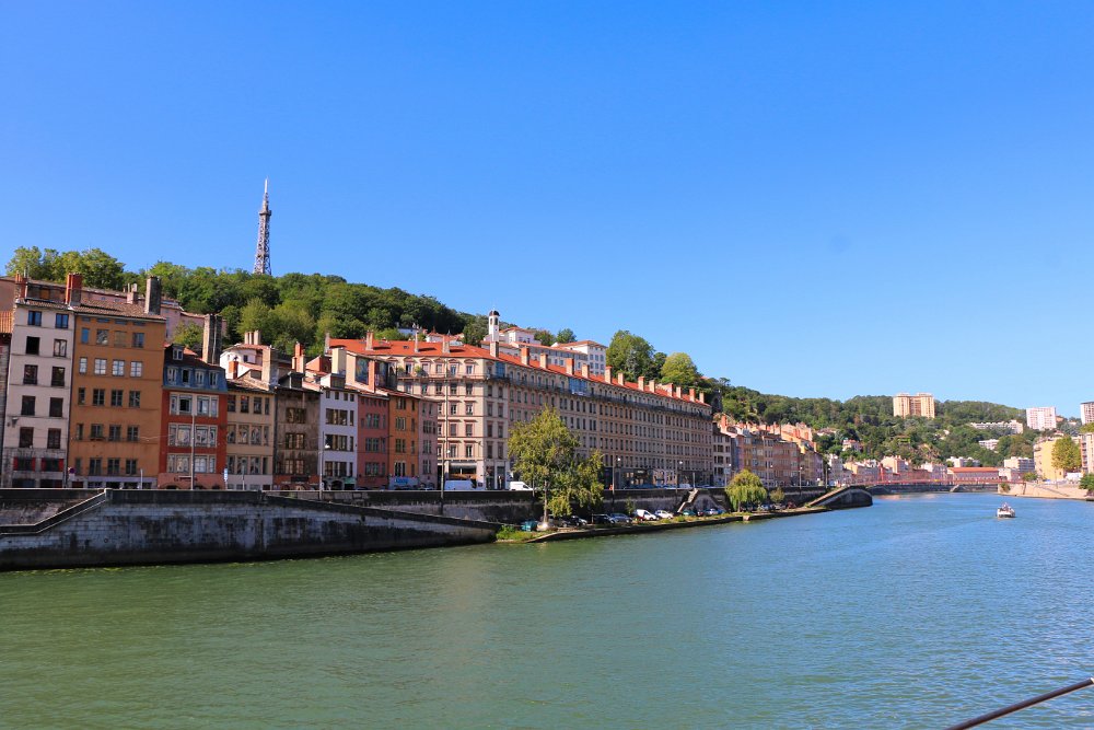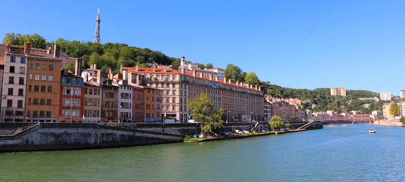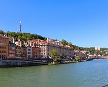 Buildings along Quai du Dr Gailleton, Lyon, France. At the top of the hill is the Tour métallique de Fourvière ("Metallic tower of Fourvière"), a landmark of…