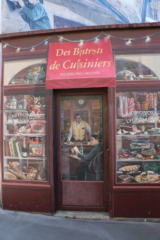 Sections that are extremely detailed, like the dozens of different breads in the baker’s window on the Lyonnais mural are done indoors and pasted on later. Each…